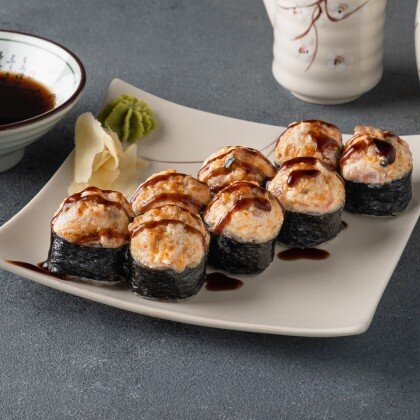 Запеченная филадельфия с тигровой креветкой под спайси соусом