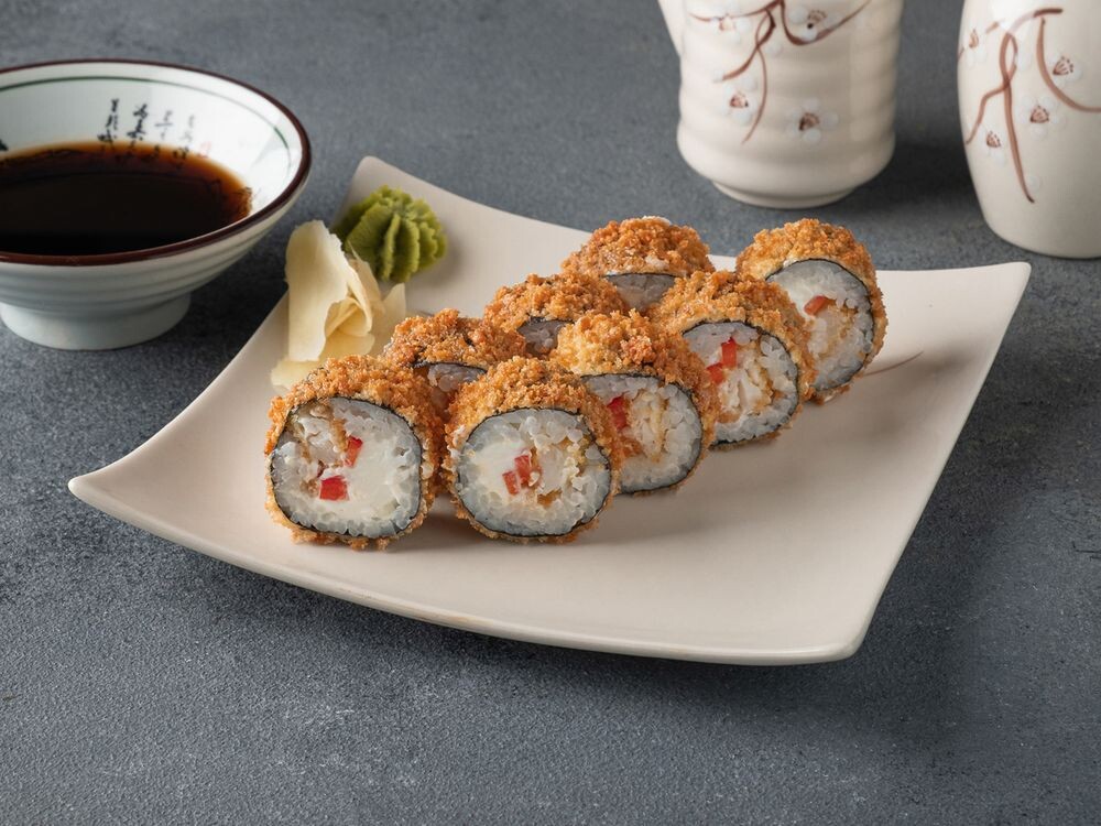 Рис, креветка тигровая, огурец, сыр сливочный, кляр, Спайси соус, имбирь