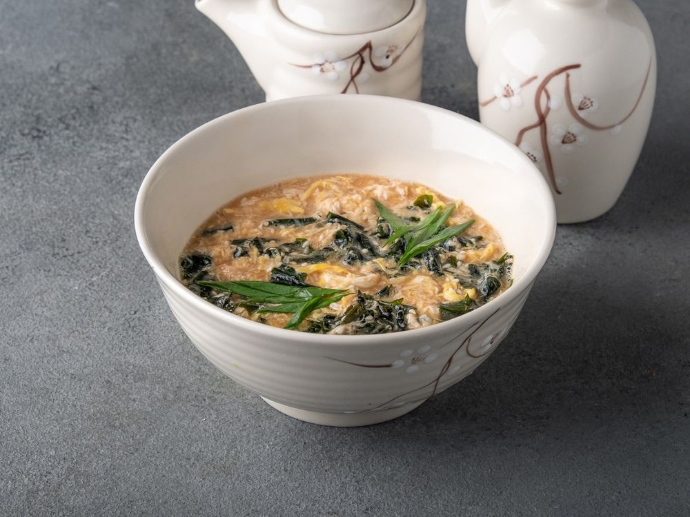Мясо бульон, яйцо куриное, тофу, масло кунжутное, соус Шрирача, вакаме замоченные, кунжут, лук зеленый