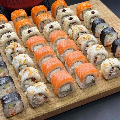 Филадельфия классик, Калифорния в масаго, ниндзяго, запеченный бекон, горячий краб, королевская креветка