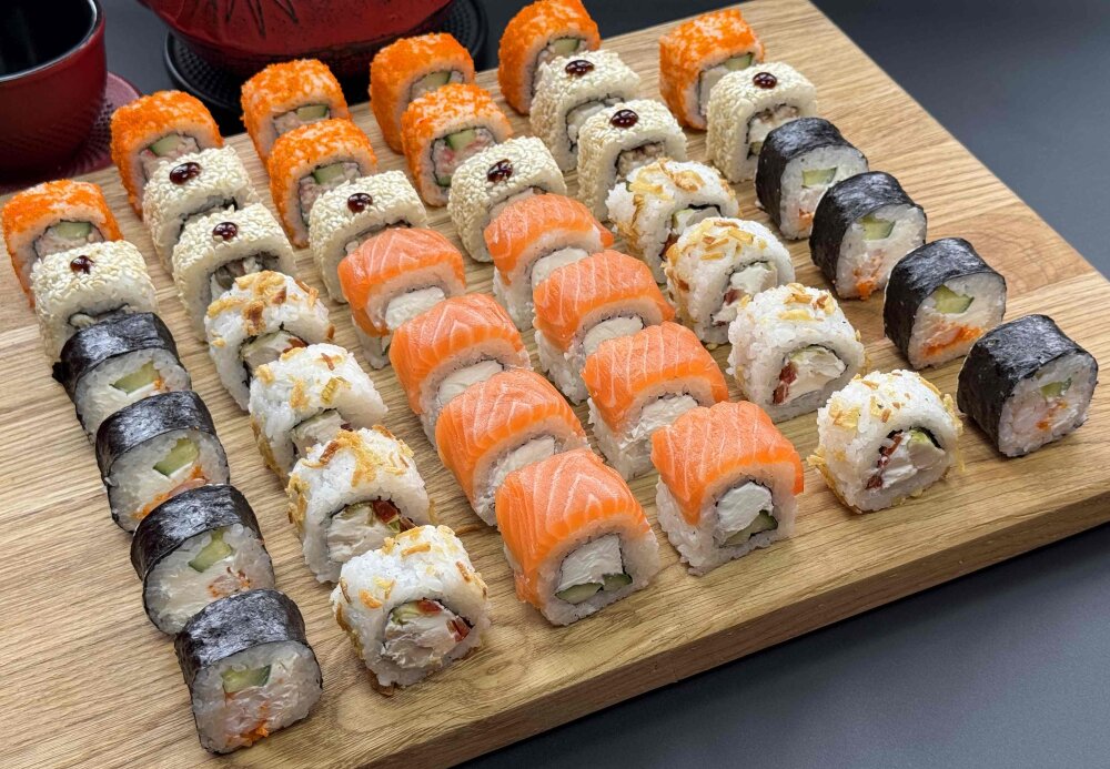 Филадельфия классик, ролл со стрипсами, королевская креветка классик, море угря, калифорния в масаго