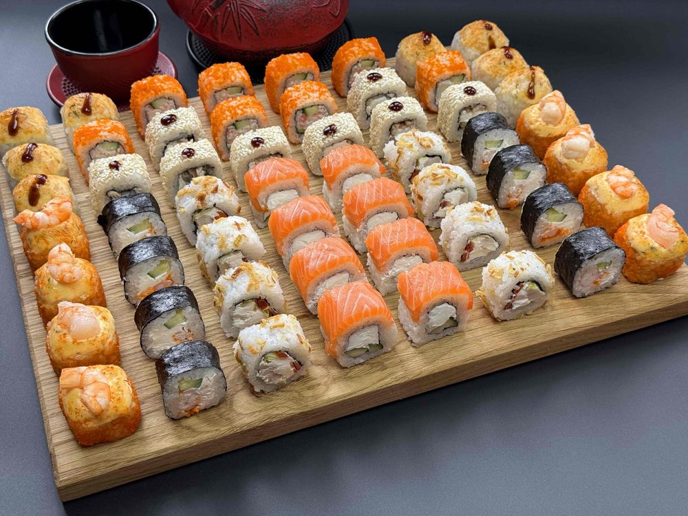 Филадельфия классик, ролл со стрипсами, королевская креветка классик, море угря, калифорния в масаго, запеченный с королевской креветкой, фудзи 2
