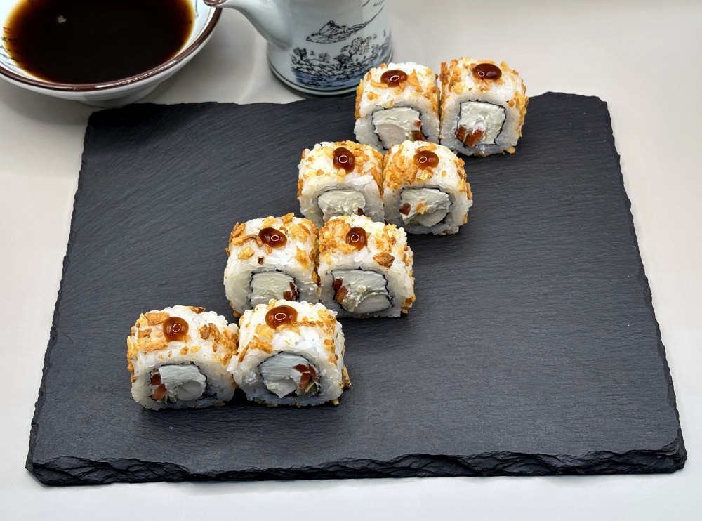 Куриные стрипсы, салат айсберг, огурец, красный сладкий перец, сыр сливочный, рис, соус Унаги, карамелизированный лук