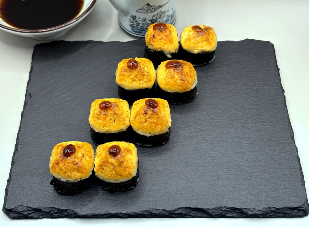 Мидии, рис, огурец, соус Унаги, соус Яки, кунжут