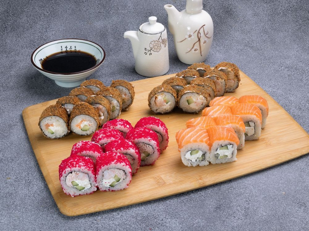Ролл Филадельфия в кляре, ролл Королевская креветка в кляре, ролл Филадельфия классик, ролл с Тигровой креветкой и крабом