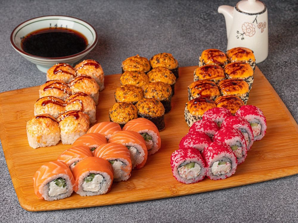 Филадельфия, Рол с тигровой креветкой и крабом ( тигровая креветка, краб-крем, огурец, сыр сливочный, рис, икра масаго), Фудзи 2, Запеченный с мидиями (острый) Чикен гриль
