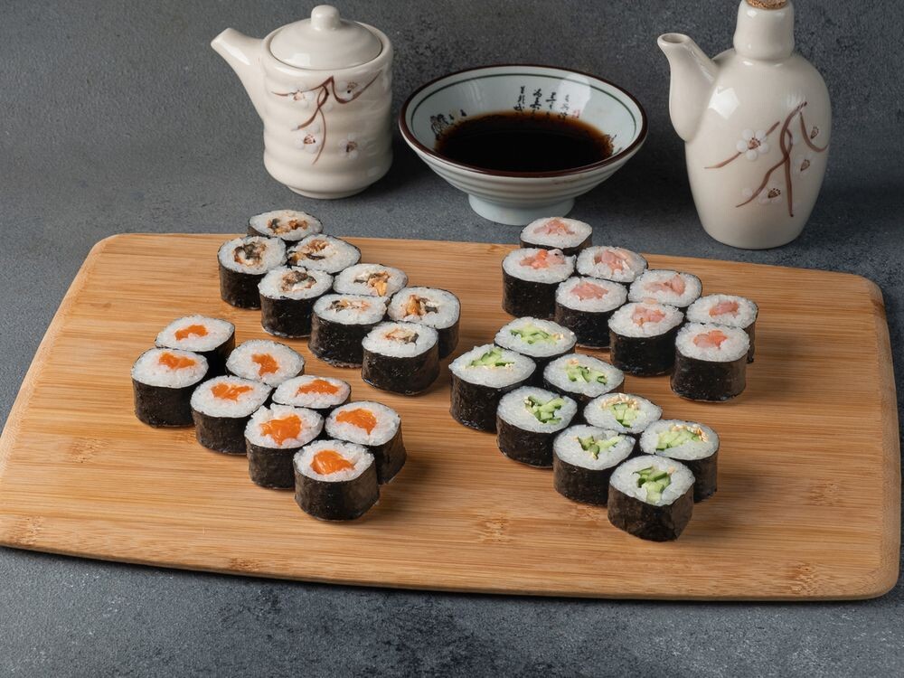 Мини-ролл с огурцом, мини-ролл с лососем, мини-ролл с угрем