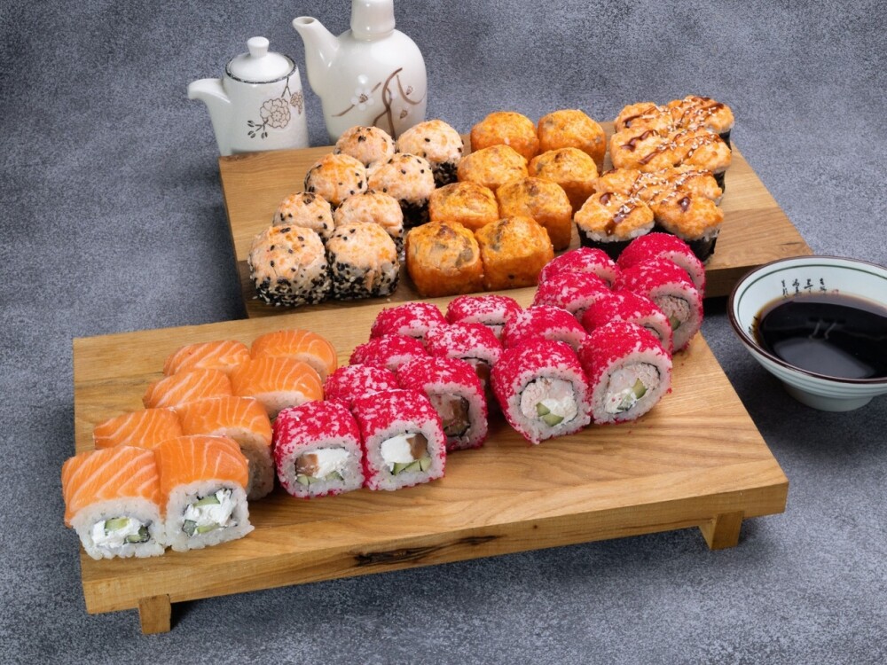 Роллы Филадельфия классик, Филадельфия в масаго, Тигровая креветка с крабом, Креветка и краб, Запеченный с лососем, Норвегия