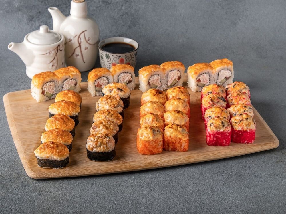 Ролл запеченный Джон (5 шт.), ролл запеченный с лососем (8 шт.), ролл запеченный Угорь и Креветка (5 шт.), ролл запеченный Грибной (8 шт.), ролл запеченный Крабовый (8 шт.)