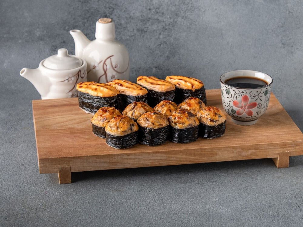 Ролл с курицей и грибами , суши запеченные Острые мидии (2 шт.), суши запеченные Острые с краб-кремом (2 шт.)
