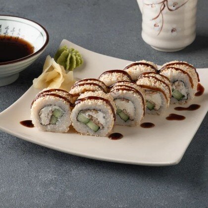 Рис, нори, сыр сливочный, омлет тамаго, икра масаго.