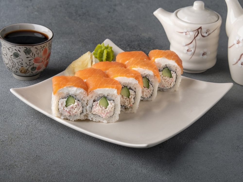 Рис, нори, краб-креб, огурец, лосось, сыр сливочный