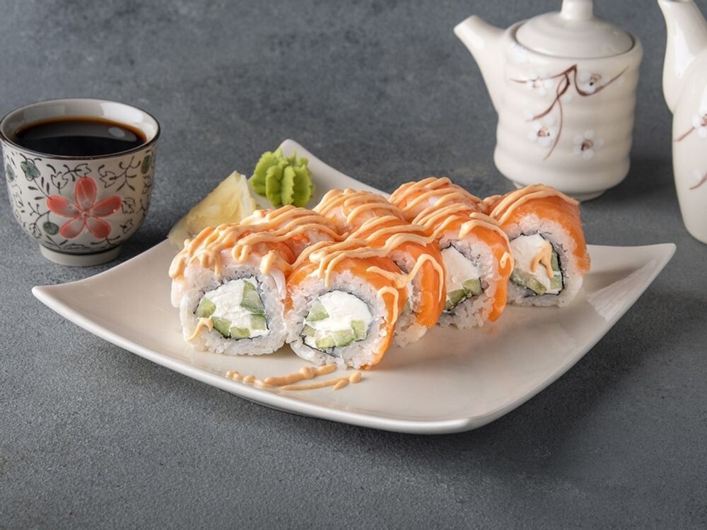 Рис, нори, сыр сливочный, огурец, лосось, тигровая креветка, спайси соус.