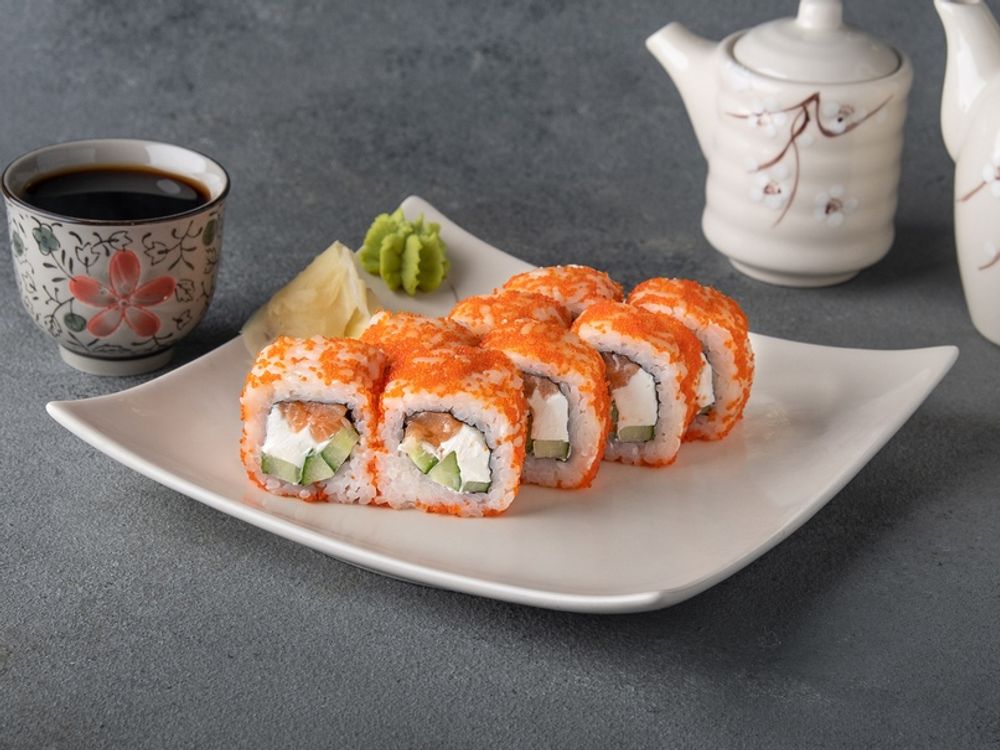 Рис, нори, лосось, сыр сливочный, огурец, икра масаго.