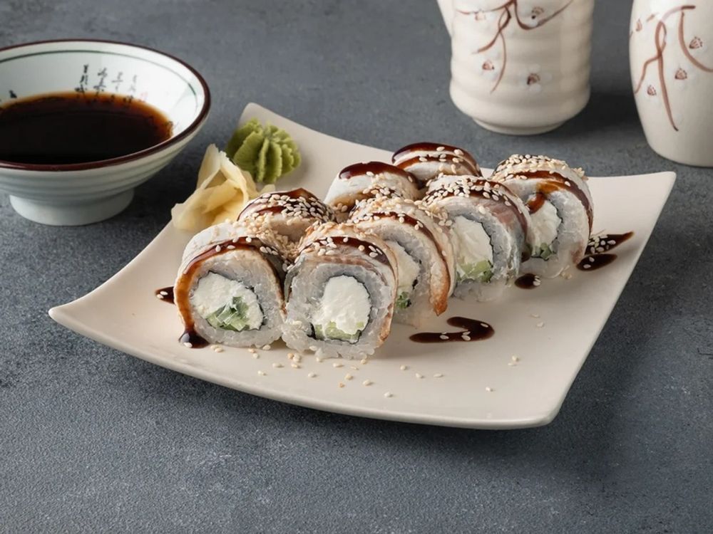 Рис, сливочный сыр, огурец, соус унаги, кунжут