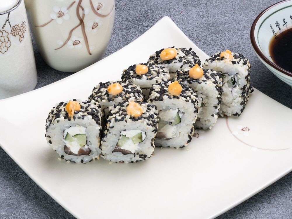 Рис, нори, сливочный сыр, кунжут микс (черный, белый), лосось, огурец, спайси соус (острый).